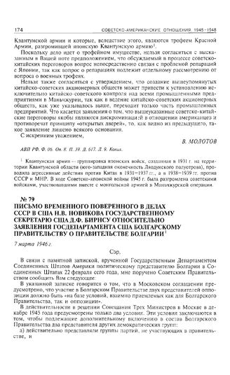 Письмо временного поверенного в делах СССР в США Н.В. Новикова государственному секретарю США Д.Ф. Бирнсу относительно заявления Госдепартамента США болгарскому правительству о правительстве Болгарии. 7 марта 1946 г.