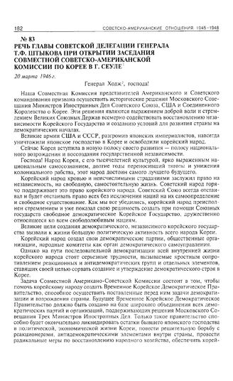 Речь главы советской делегации генерала Т.Ф. Штыкова при открытии заседания Совместной советско-американской комиссии по Корее в г. Сеуле. 20 марта 1946 г.