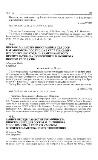 Письмо министра иностранных дел СССР В.М. Молотова послу США в СССР У.Б. Смиту относительно согласия американского правительства на назначение Н.В. Новикова послом СССР в США. 10 апреля 1946 г.