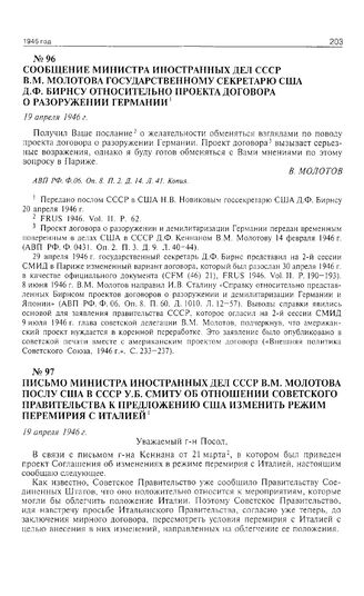 Сообщение министра иностранных дел СССР В.М. Молотова государственному секретарю США Д.Ф. Бирнсу относительно проекта договора о разоружении Германии. 19 апреля 1946 г.