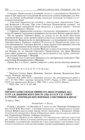Письмо заместителя министра иностранных дел СССР А.Я. Вышинского послу США в СССР У.Б. Смиту о группе американских военных советников в Китае. 19 апреля 1946 г.