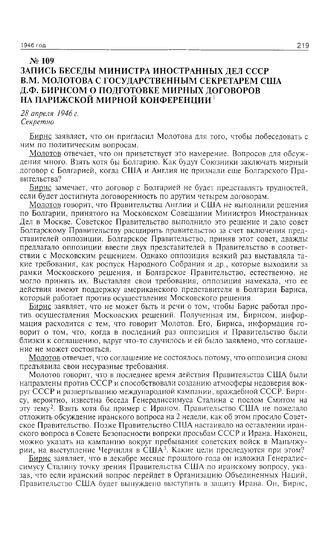 Запись беседы министра иностранных дел СССР В.М. Молотова с государственным секретарем США Д.Ф. Бирнсом о подготовке мирных договоров на Парижской мирной конференции. 28 апреля 1946 г. // АВП РФ. Ф. 06. Оп. 8. П. 1. Д. 7. Л. 141-147. Копия.