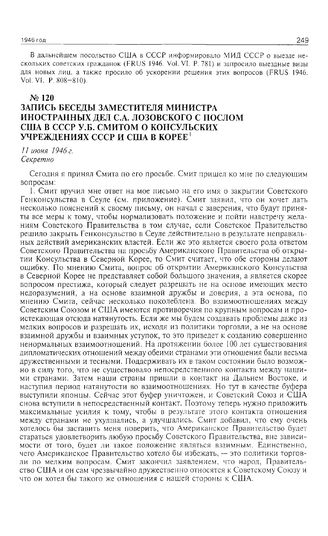 Запись беседы заместителя министра иностранных дел СССР С.А. Лозовского с послом США в СССР У.Б. Смитом о консульских учреждениях СССР и США в Корее. 11 июня 1946 г.
