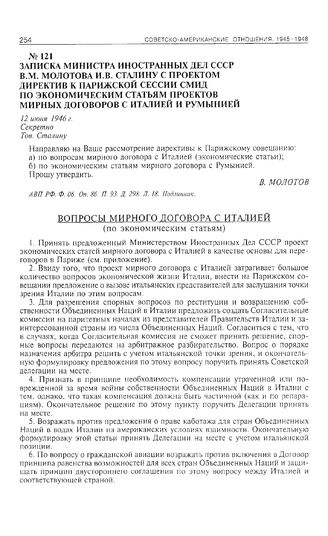 Записка министра иностранных дел СССР В.М. Молотова И.В. Сталину с проектом директив к Парижской сессии СМИД по экономическим статьям проектов мирных договоров с Италией и Румынией. 12 июня 1946 г. // АВП РФ. Ф. 06. Оп. 86. П. 93. Д. 298. Л. 18-28.