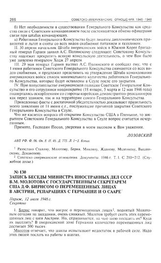 Запись беседы министра иностранных дел СССР В.М. Молотова с государственным секретарем США Д.Ф. Бирнсом о перемещенных лицах в Австрии, репарациях с Германии и о Сааре. Париж, 12 июля 1946 г. // АВП РФ. Ф. 06. Оп. 8. П. 2. Д. 10. Л. 22-24. Подлинник.