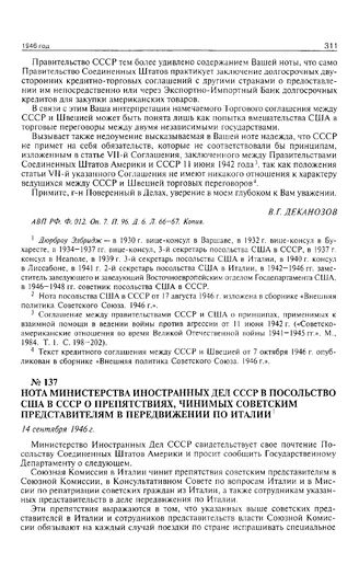 Нота Министерства иностранных дел СССР в посольство США в СССР о препятствиях, чинимых советским представителям в передвижении по Италии. 14 сентября 1946 г.