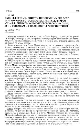 Запись беседы министра иностранных дел СССР В.М. Молотова с государственным секретарем США Д.Ф. Бирнсом о Нью-Йоркской сессии СМИД и по вопросам Свободной территории Триест. 25 ноября 1946 г. // АВП РФ. Ф. 06. Оп. 8. П. 2. Д. 13. Л. 40-45. Подлинник.