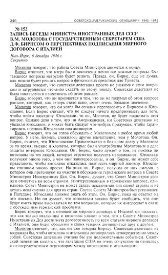 Запись беседы министра иностранных дел СССР В.М. Молотова с государственным секретарем США Д.Ф. Бирнсом о перспективах подписания мирного договора с Италией. Нью-Йорк, 6 декабря 1946 г.