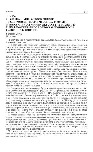 Докладная записка постоянного представителя СССР при ООН А.А. Громыко министру иностранных дел СССР В.М. Молотову с предложениями по вопросу о позиции СССР в Атомной комиссии. 6 декабря 1946 г. // АВП РФ. Ф. 07. Оп. 21в. П. 46. Д. 13. Л. 199-201. Подлинник.