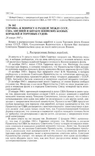 Справка «К вопросу о разделе между СССР. США, Англией и Китаем японских боевых кораблей и торговых судов». 24 января 1947 г. // АВП РФ. Ф. 06. Оп. 9. П. 70. Д. 1080. Л. 1-5.