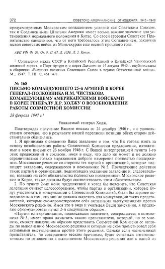 Письмо командующего 25-й армией в Корее генерал-полковника И М. Чистякова командующему американскими войсками в Корее генералу Д.Р. Ходжу о возобновлении работы Совместной комиссии. 28 февраля 1947 г. // АВП РФ. Ф. 06. Оп. 9. П. 59. Д. 878. Л. 5-6. Копия.