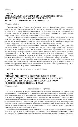 Письмо министра иностранных дел СССР В.М. Молотова госсекретарю США Д.К. Маршаллу о согласии на проведение неформального совещания по вопросам Китая. 11 марта 1947 г.