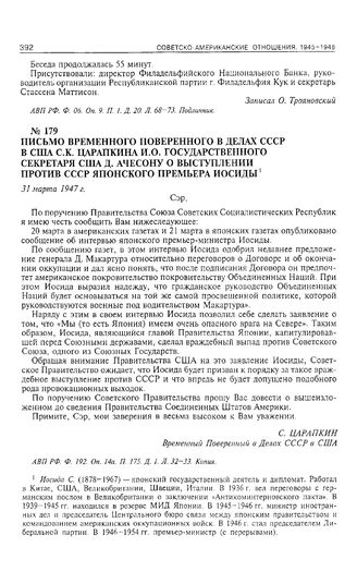 Письмо временного поверенного в делах СССР в США С.К. Царапкина и.о. государственного секретаря США Д. Ачесону о выступлении против СССР японского премьера Иосиды. 31 марта 1947 г. // АВП РФ. Ф. 192. Оп. 14а. П. 175. Д. 1. Л. 32-33. Копия.