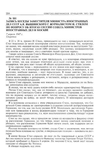 Запись беседы заместителя министра иностранных дел СССР А.Я. Вышинского с журналистом И. Стилом по вопросу об итогах сессии Совета министров иностранных дел в Москве. 7 апреля 1947 г. // АВП РФ. Ф. 07. Оп. 12. П. 2. Д. 24. Л. 10-11. Подлинник.
