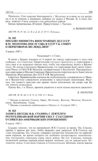 Запись беседы И.В. Сталина с деятелем Республиканской партии США Г. Стассеном о советско-американских отношениях. 9 апреля 1947 г. // РГАСПИ. Ф. 558. Оп. 11. Д. 384. Л. 18-32. Подлинник. «Внешняя политика Советского Союза», 1947 г. Ч. I. С. 15-27.