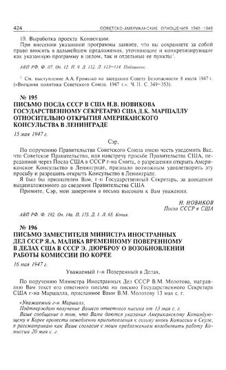 Письмо заместителя министра иностранных дел СССР Я.А. Малика временному поверенному в делах США в СССР Э. Дюрброу о возобновлении работы Комиссии по Корее. 16 мая 1947 г.