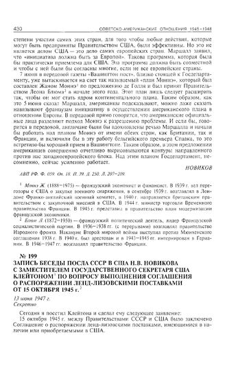 Запись беседы посла СССР в США Н.В. Новикова с заместителем государственного секретаря США Клейтоном по вопросу выполнения соглашения о распоряжении ленд-лизовскими поставками от 15 октября 1945 г. 13 июня 1947 г. // АВП РФ. Ф. 07. Оп. 9. П. 71. Д. 1100. Л. 71-74. Подлинник.