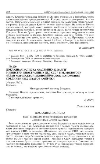 Докладная записка академика Е. Варги министру иностранных дел СССР В.М. Молотову «План Маршалла и экономическое положение Соединенных Штатов Америки». 24 июня 1947 г.