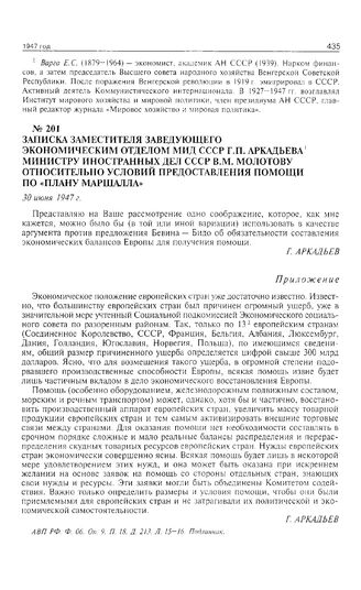 Записка заместителя заведующего Экономическим отделом МИД СССР Г.П. Аркадьева министру иностранных дел СССР В.М. Молотову относительно условий предоставления помощи по «плану Маршалла». 30 июня 1947 г. // АВП РФ. Ф. 06. Оп. 9. П. 18. Д. 213. Л. 15-16. Подлинник.