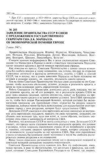 Заявление правительства СССР в связи с предложением государственного секретаря США Д.К. Маршалла об экономической помощи Европе. 5 июля 1947 г. // АВП РФ. Ф. 06. Оп. 9. П. 20. Д. 236. Л. 3-4. Копия.