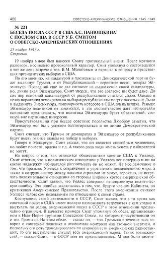 Беседа посла СССР в США А.С. Панюшкина с послом США в СССР У.Б. Смитом о советско-американских отношениях. 21 ноября 1947 г.