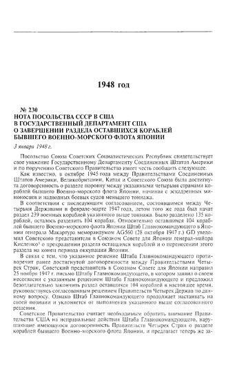 Нота посольства СССР в США в Государственный департамент США о завершении раздела оставшихся кораблей бывшего Военно-морского флота Японии. 3 января 1948 г. // АВП РФ. Ф. 192. Оп. 15а. П. 150. Д. 1. Л. 1-3. Копия.