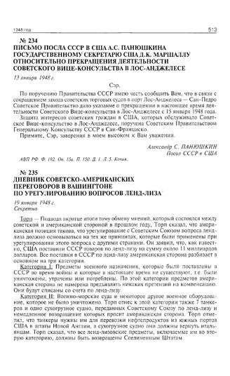 Дневник советско-американских переговоров в Вашингтоне по урегулированию вопросов ленд-лиза. 19 января 1948 г. // АВП РФ. Ф. 06. Оп. 10. П. 68. Д. 947. Л. 1-6. Подлинник.