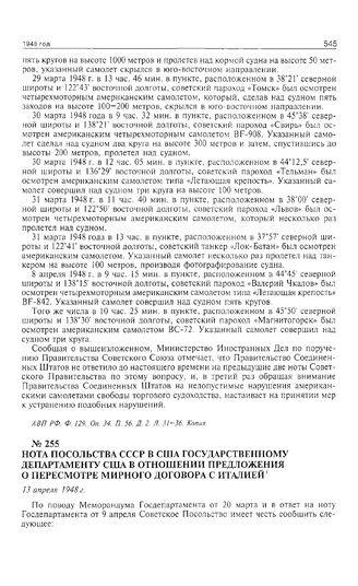 Нота посольства СССР в США Государственному департаменту США в отношении предложения о пересмотре мирного договора с Италией. 13 апреля 1948 г. // АВП РФ. Ф. 190. Оп. 15а. П. 150. Д. 1. Л. 63-64. Копия.
