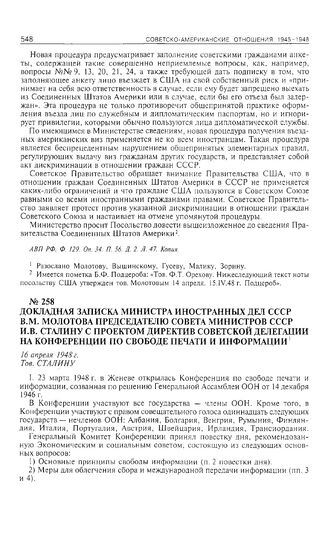 Докладная записка министра иностранных дел СССР В.М. Молотова председателю Совета министров СССР И.В. Сталину с проектом директив советской делегации на конференции по свободе печати и информации. 16 апреля 1948 г.