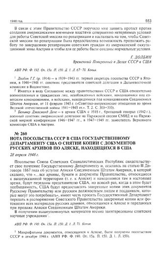 Нота посольства СССР в США Государственному департаменту США о снятии копии с документов русских архивов по Аляске, находящихся в США. 28 апреля 1948 г. // АВП РФ. Ф. 190. Оп. 15а. П. 150. Д. 1. Л. 71. Копия.