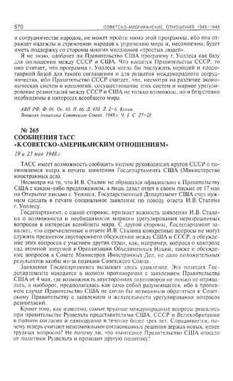 Сообщения ТАСС «К советско-американским отношениям». 19 и 23 мая 1948 г. // АВП РФ. Ф. 0129. Оп. 326. П. 335. Д. 1. Л. 390-404. Копия. Внешняя политика Советского Союза. 1948 г. Ч. I. С. 203-214.