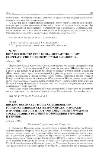 Письмо посла СССР в США А.С. Панюшкина государственному секретарю США Д.К. Маршаллу о нарушении США и другими западными державами согласованных решений в отношении Германии и Берлина. 14 июля 1948 г. // АВП РФ. Ф. 192. Оп. 15а. П. 150. Д. 1. Л. 113-120. Копия. Внешняя политика Советского Союза. 1948 г. Ч. II. С. 22-26.