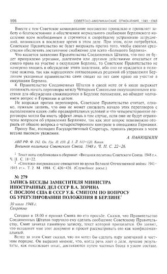 Запись беседы заместителя министра иностранных дел СССР В.А. Зорина с послом США в СССР У.Б. Смитом по вопросу об урегулировании положения в Берлине. 30 июля 1948 г. // АВП РФ. Ф. 07. Оп. 21ж. П. 43. Д. 4. Л. 1-4. Копия.