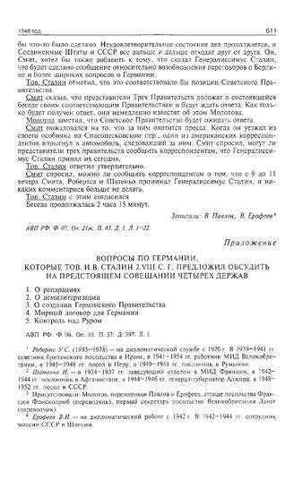 Приложение к записи беседы И.В. Сталина с послом США в СССР У.Б. Смитом, представителем министра иностранных дел Великобритании У. Робертсом и послом Франции в СССР И. Шатеньо. Вопросы по Германии, которые тов. И.В. Сталин 2.VIII с. г. предложил обсудить на предстоящем совещании четырех держав
