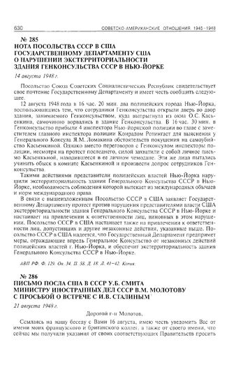 Нота посольства СССР в США Государственному департаменту США о нарушении экстерриториальности здания генконсульства СССР в Нью-Йорке, 14 августа 1948 г. // АВП РФ. Ф. 129. Оп. 34. П. 58. Д. 18. Л. 41-42. Копия.