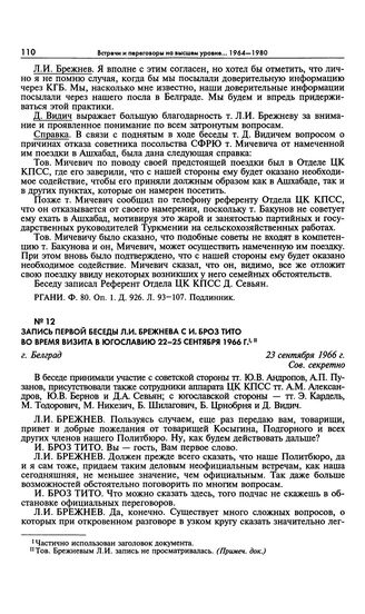 Запись первой беседы Л.И. Брежнева с И. Броз Тито во время визита в Югославию 22-25 сентября 1966 г. г. Белград. 23 сентября 1966 г. // РГАНИ. Ф. 80. Оп. 1. Д. 926. Л. 108-130. Подлинник.