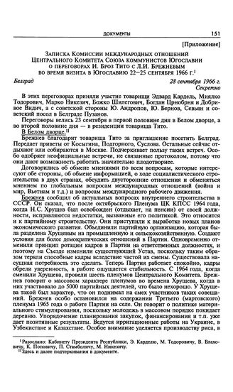 Приложение к записи четвертой беседы Л.И. Брежнева с И. Броз Тито. Записка Комиссии международных отношений Центрального Комитета Союза коммунистов Югославии о переговорах И. Броз Тито с Л.И. Брежневым во время визита в Югославию 22-25 сентября 1966 г. Белград. 28 сентября 1966 г. // AJ. КПР І-З-а/101-84. Подлинник. Перевод с сербского.