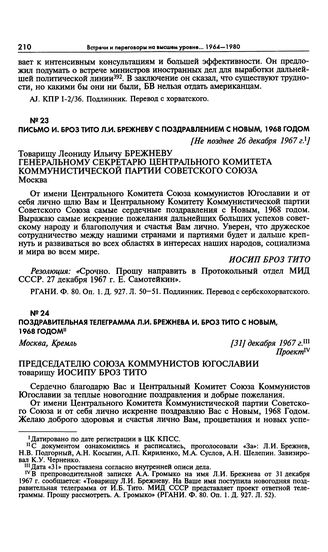 Поздравительная телеграмма Л.И. Брежнева И. Броз Тито с Новым, 1968 годом. [31] декабря 1967 г.