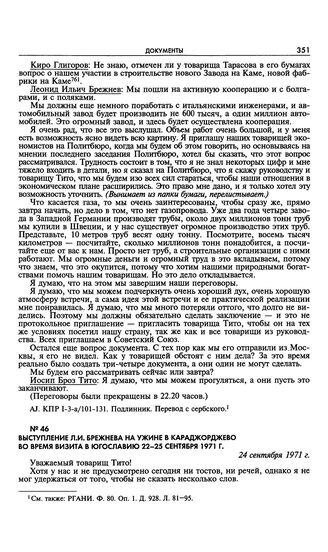 Выступление Л.И. Брежнева на ужине в Караджорджево во время визита в Югославию 22-25 сентября 1971 г. 24 сентября 1971 г.