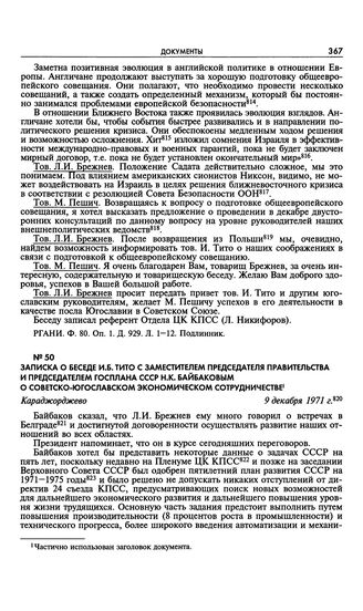 Записка о беседе И.Б. Тито с заместителем председателя правительства и председателем Госплана СССР Н.К. Байбаковым о советско-югославском экономическом сотрудничестве. Караджорджево. 9 декабря 1971 г. // AJ. КПР І-3-а/101-133. Подлинник. Перевод с сербского.