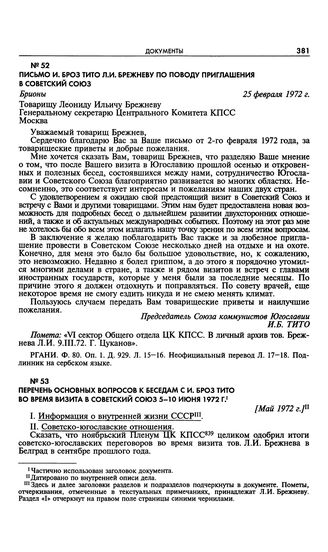 Письмо И. Броз Тито Л.И. Брежневу по поводу приглашения в Советский Союз. Брионы. 25 февраля 1972 г. // РГАНИ. Ф. 80. Оп. 1. Д. 929. Л. 15-16. Неофициальный перевод Л. 17-18. Подлинник на сербском языке.