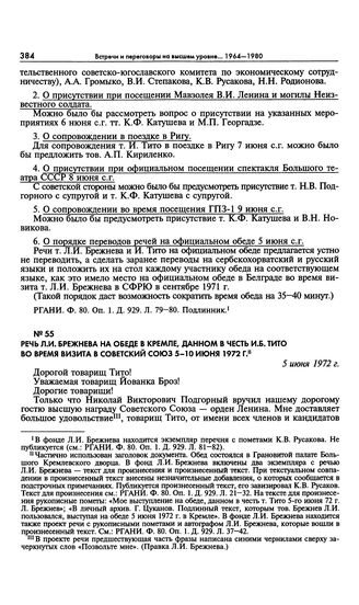 Речь Л.И. Брежнева на обеде в Кремле, данном в честь И.Б. Тито во время визита в Советский Союз 5-10 июня 1972 г. 5 июня 1972 г.