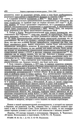 Запись переговоров Л.И. Брежнева с И. Броз Тито в Белграде во время визита в Югославию 15-17 ноября 1976 г. 15 ноября 1976 г. // РГАНИ. Ф. 80. Оп. 1. Д. 932. Л. 1-24. Подлинник.