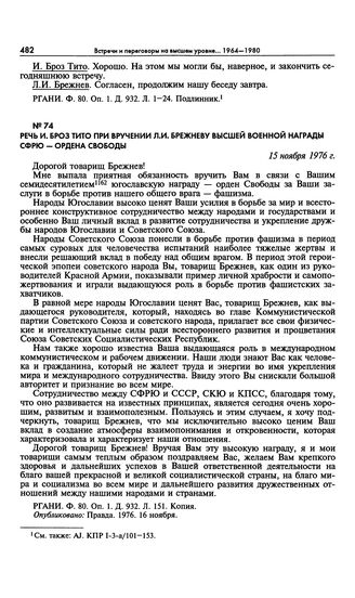 Речь И. Броз Тито при вручении Л.И. Брежневу высшей военной награды СФРЮ — ордена Свободы. 15 ноября 1976 г. // РГАНИ. Ф. 80. Оп. 1. Д. 932. Л. 151. Копия. Опубликовано: Правда. 1976. 16 ноября.