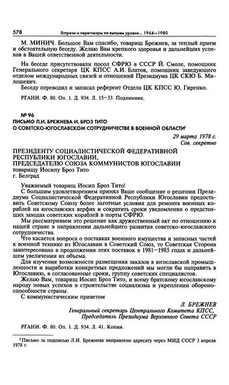 Письмо Л.И. Брежнева И. Броз Тито о советско-югославском сотрудничестве в военной области. 29 марта 1978 г.