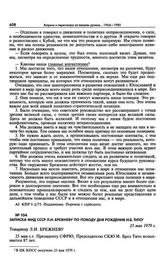 Записка МИД СССР Л.И. Брежневу по поводу дня рождения И.Б. Тито. 23 мая 1979 г. // РГАНИ. Ф. 80. Оп. 1. Д. 935. Л. 75. Подлинник.