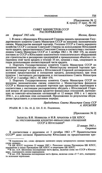 Приложение № 1 к постановлению Президиума ЦК КПСС «Об увеличении срока погашения кредита, предоставляемого Советским Союзом Югославии для строительства предприятий в районе г. Скопле, и об урегулировании кредитно-финансовых отношений по Советско-Югославским Соглашениям от 12 января и 1 августа 1956 года». Распоряжение Совета Министров СССР // РГАНИ. Ф. 3. Оп. 18. Д. 324. Л. 61. Подлинник.