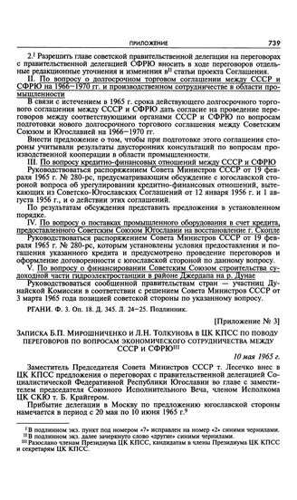Приложение № 3 к постановлению Президиума ЦК КПСС «О переговорах по вопросам экономического сотрудничества между СССР и СФРЮ». Записка Б.П. Мирошниченко и Л.Н. Толкунова в ЦК КПСС по поводу переговоров по вопросам экономического сотрудничества между СССР и СФРЮ. 10 мая 1965 г.