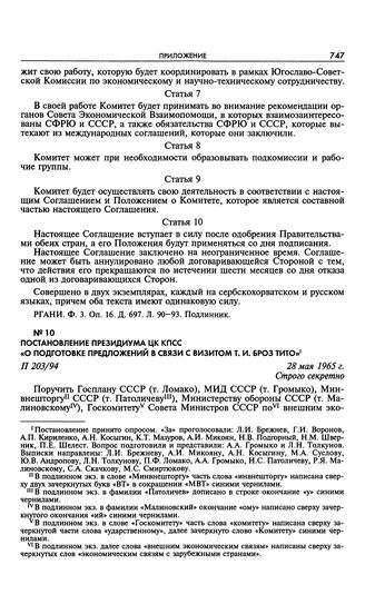Постановление Президиума ЦК КПСС «О подготовке предложений в связи с визитом т. И. Броз Тито». 28 мая 1965 г.
