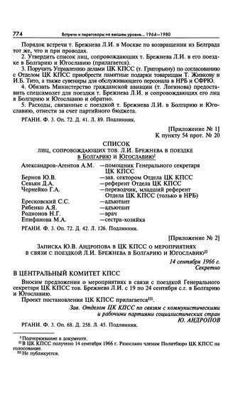 Приложение № 1 к постановлению Политбюро ЦК КПСС «О мероприятиях в связи с поездкой в сентябре с.г. Генерального секретаря ЦК КПСС т. Брежнева Л.И. в Болгарию и Югославию». 15 сентября 1966 г. Список лиц, сопровождающих тов. Л.И. Брежнева в поездке в Болгарию и Югославию